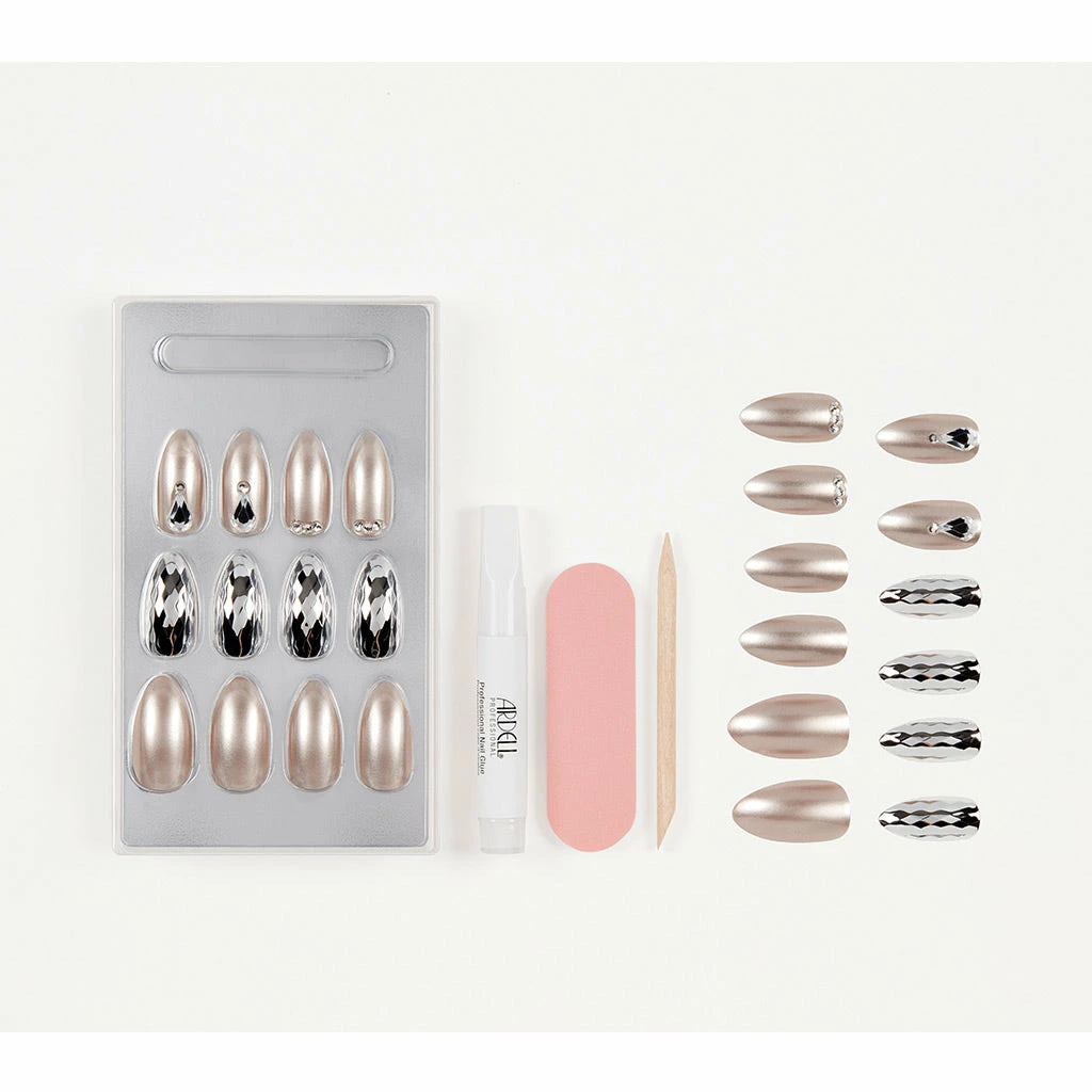 Add some glamour to your look with Ardell Nails Nail Addict Premium False Nails in Champagne Ice. The combination of frosted matte, shiny chrome, and crystal designs makes these glittery, shiny nails perfect for a night out on the town – or whenever you want to add some dazzle and sparkle to your outfit. The almond shape and long length will have you looking like a rock star the next time you hit the town.