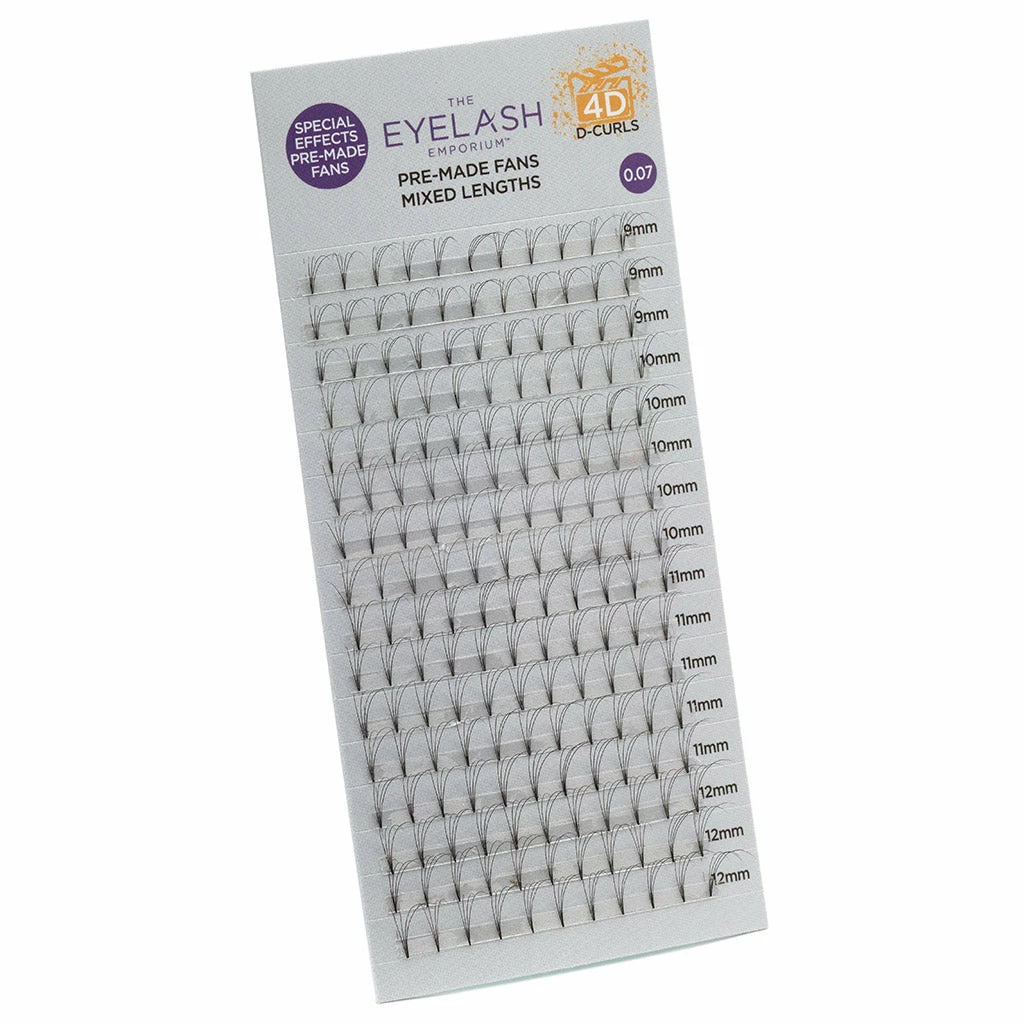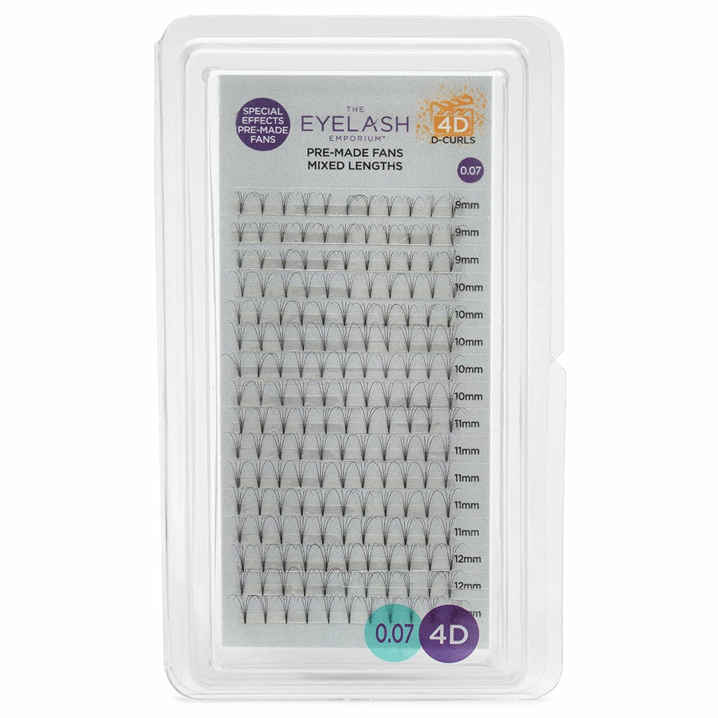 Create show-stopping, special effect lashes with the classic Eyelash Emporium 4D D Curls Pre-Made Fans. The fused technology creates the lightest weight fan, giving maximum impact to a variety of eye shapes and lash profiles.