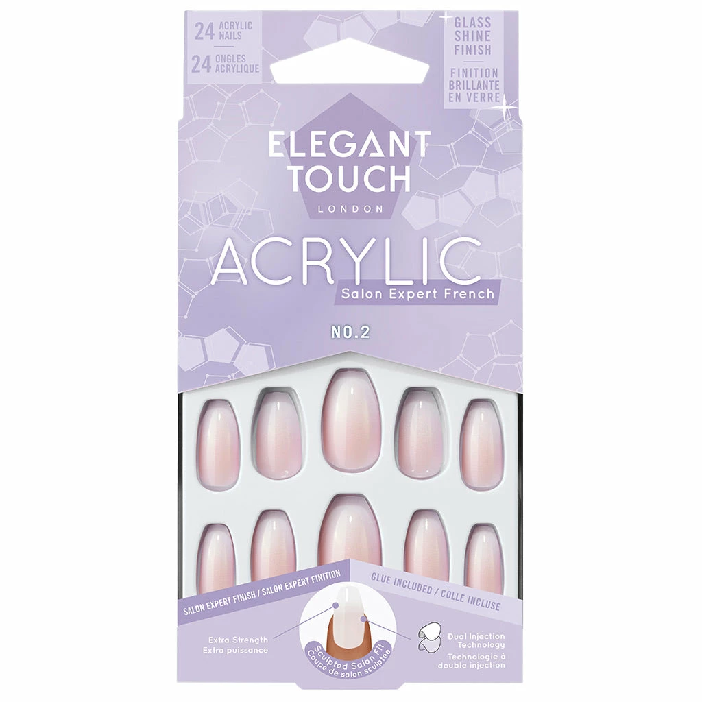 Elegant Touch False Nails Acrylic Salon Expert French No 2 is the perfect French ombre coffin nail. With a salon sculpted fit, these nails will seamlessly contour to your cuticle for the full salon effect. Dual injection technology adds strength at the tip to reinforce the nail, making them feel extra secure at all times. All with the perfected Elegant Touch glass shine finish!