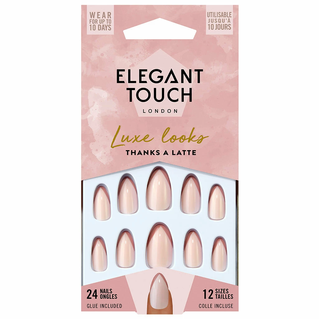 Each box of Elegant Touch Luxe Looks False Nails in style Thanks A Latte contains 24 nails (in 12 sizes), plus one nail glue. Every order placed here at FalseEyelashes.co.uk comes with FREE 1st Class delivery in the UK when you spend £20+. Place your Elegant Touch false nails order with us now!