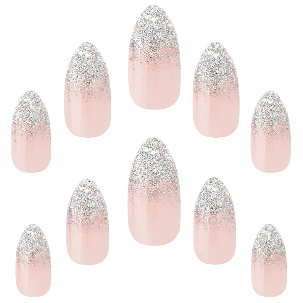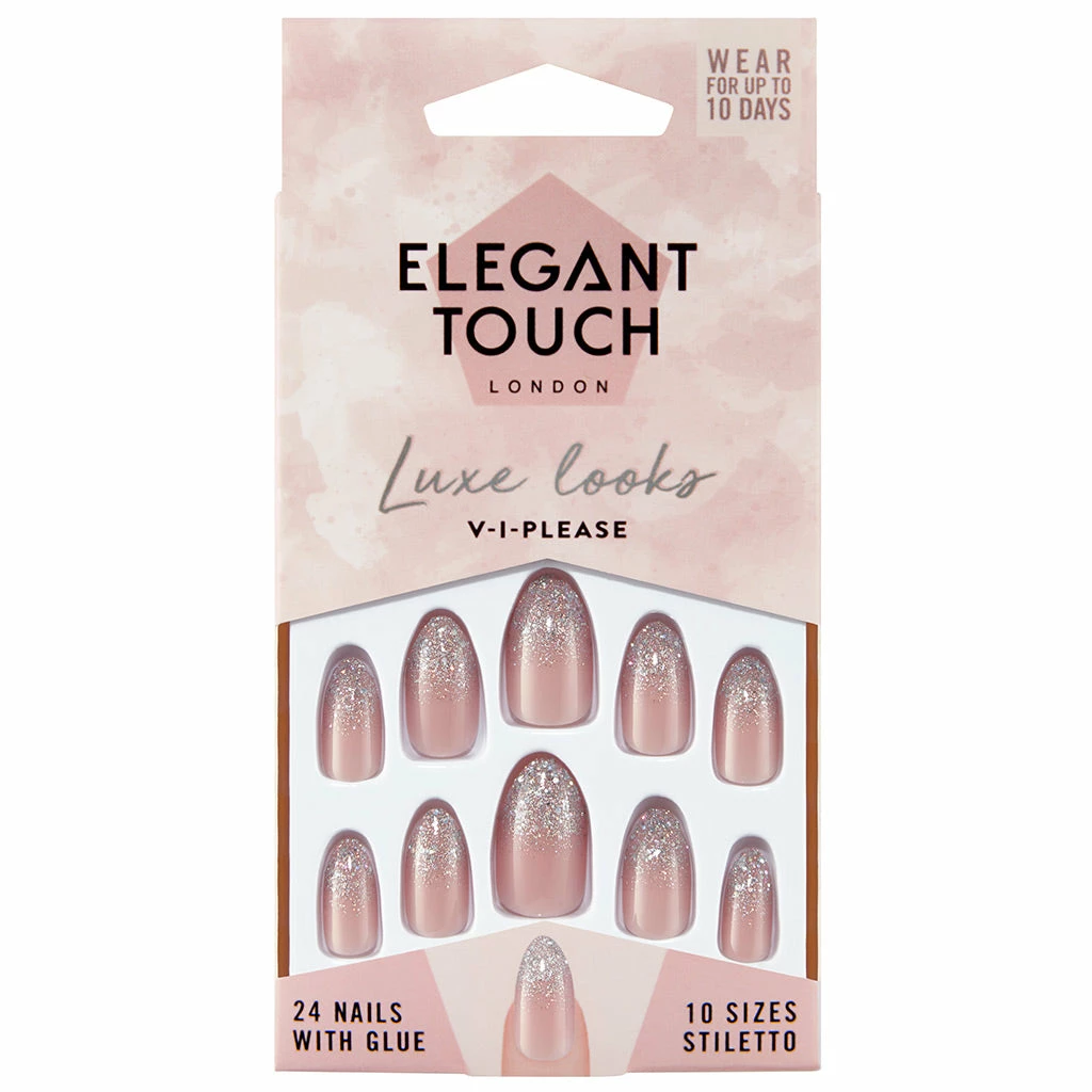 Elegant Touch Luxe Looks V-I-Please false nails are real head-turners! Demonstrate your VIP status to the world with these chic stiletto nails in a perfect nude with stunning glitter ombre tips. VIP?… yes please!