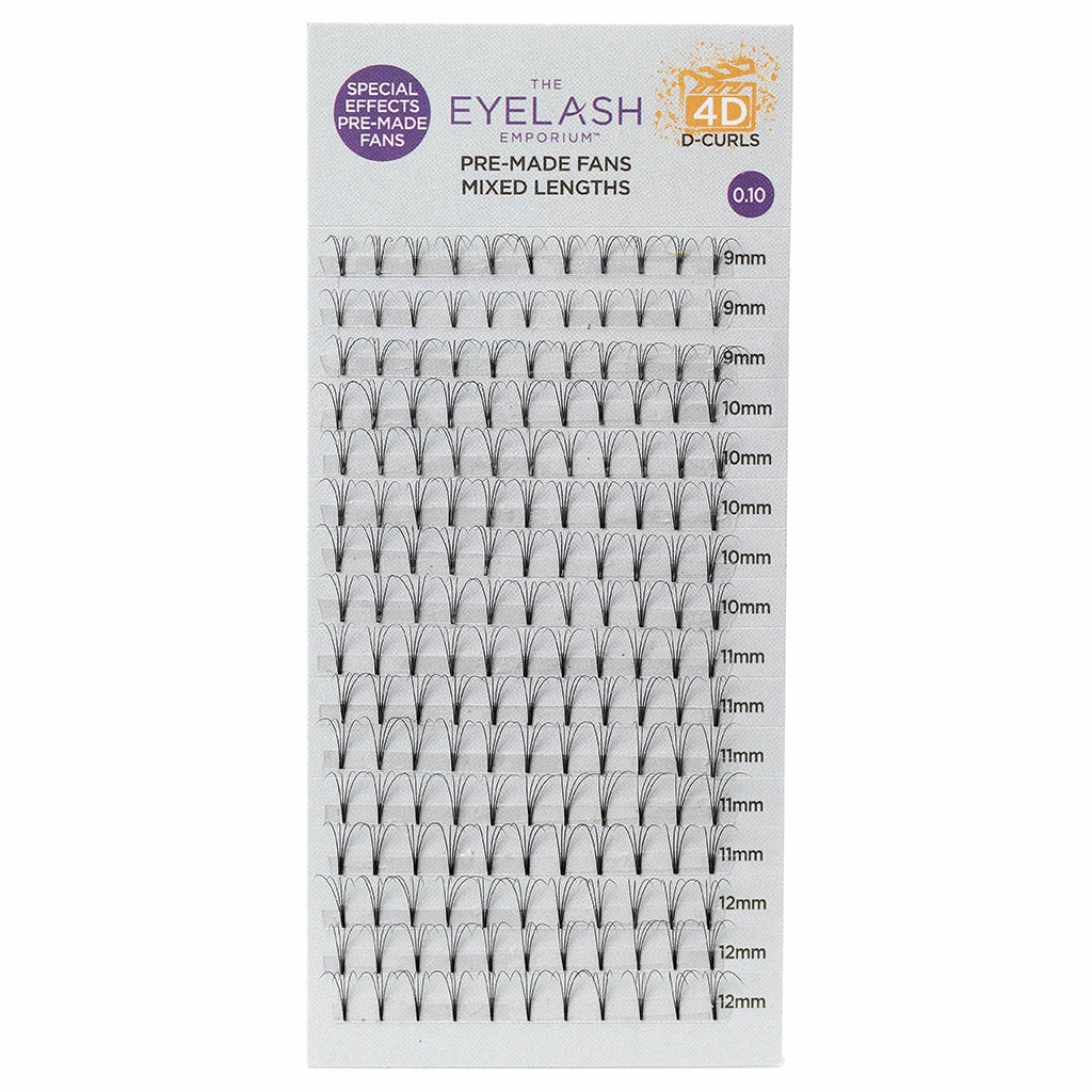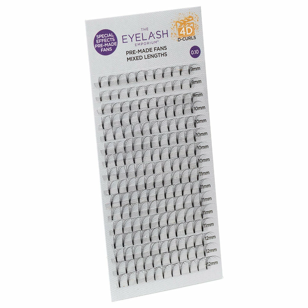 Create show-stopping, special effect lashes with the classic Eyelash Emporium 4D D Curls Pre-Made Fans. The fused technology creates the lightest weight fan, giving maximum impact to a variety of eye shapes and lash profiles.