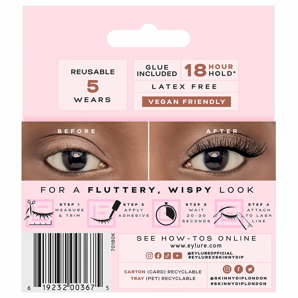 Each pack contains one pair of Eylure x Skinnydip Natural Lashes in style 165. One 1ml, latex-free lash glue is also included. Every order placed here at FalseEyelashes.co.uk comes with FREE 1st Class delivery in the UK when you spend £20 or more. Don’t delay, place your Eylure order with us now!