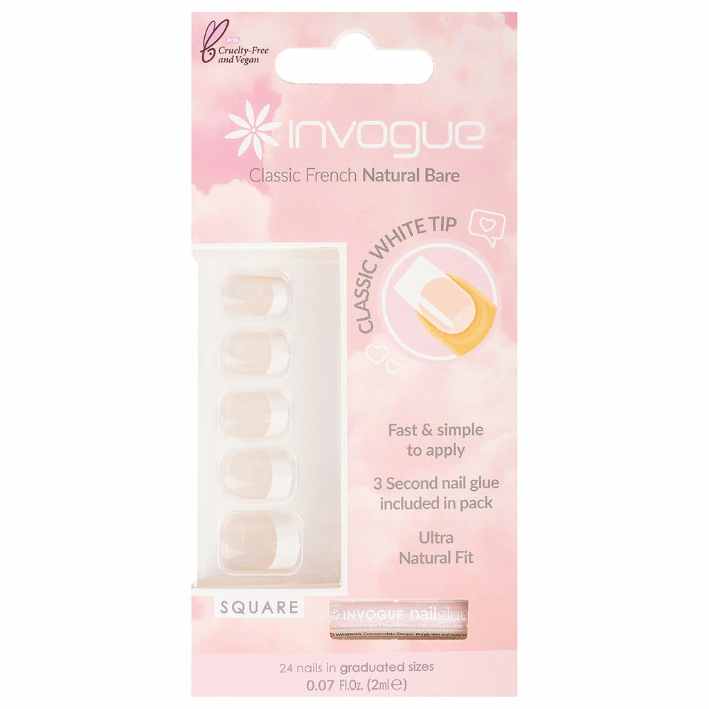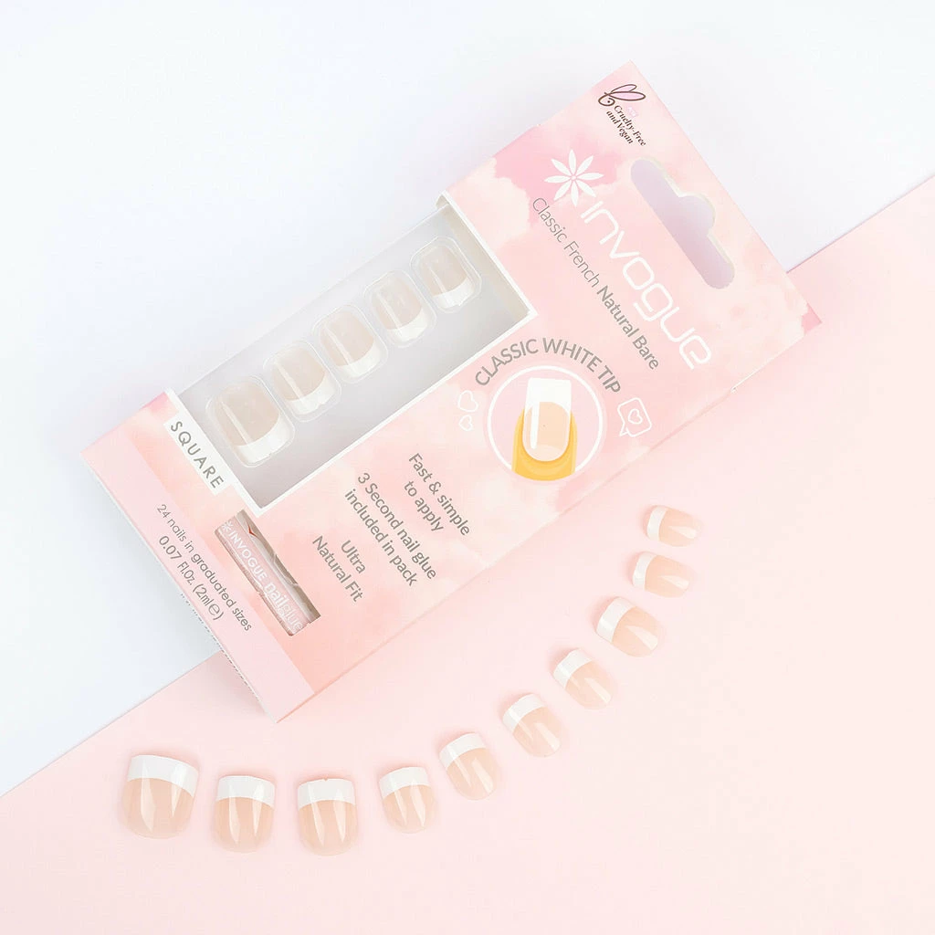 These Invogue False Nails are medium length and square-shaped. They come in a natural bare shade, making them ideal for a classic French manicure. Invogue false nails are fast and simple to apply, and they offer an ultra-natural fit. If you’re looking for nails that boast a flawless manicured look without the expense of visiting a salon, then your search is over.