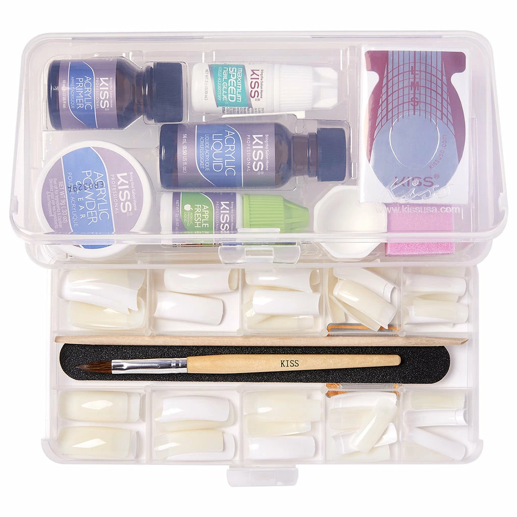 Each Kiss Complete Salon Acrylic Kit contains: 24 white tips, 40 natural tips, 20 sculpture nail forms, apple fresh acrylic liquid masking formula (2ml), acrylic liquid (14ml), acrylic powder (9g), acrylic primer (9ml), maximum speed nail glue (3g), professional acrylic brush, buff block, dappen dish, 2-way nail file, manicure stick, storage container and instruction sheet.