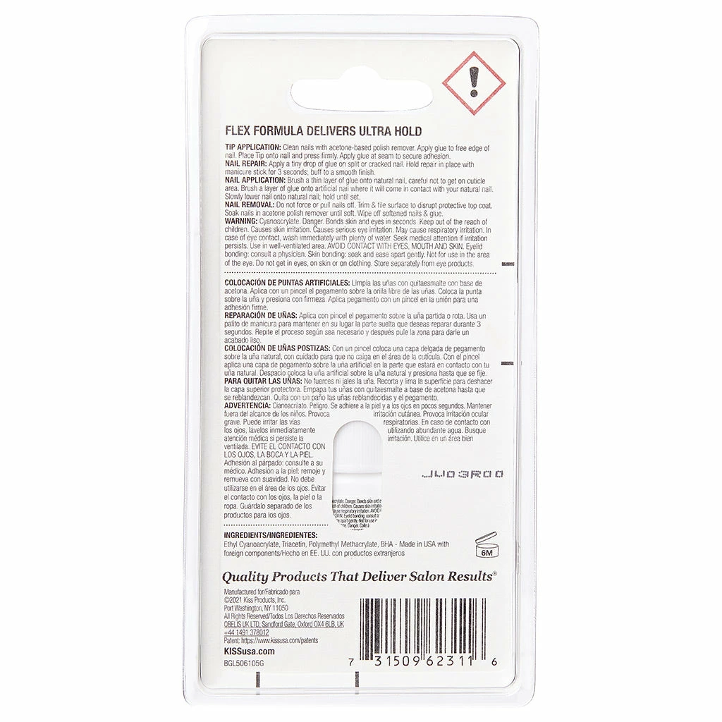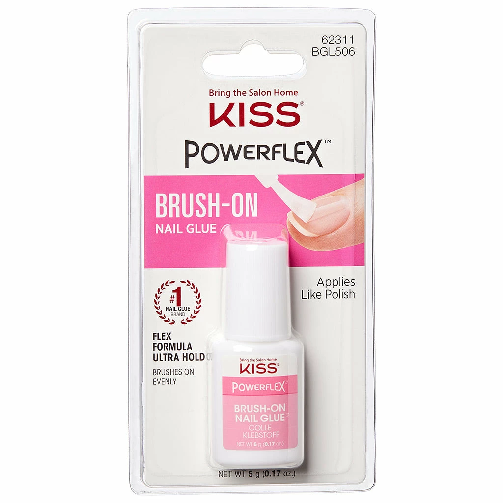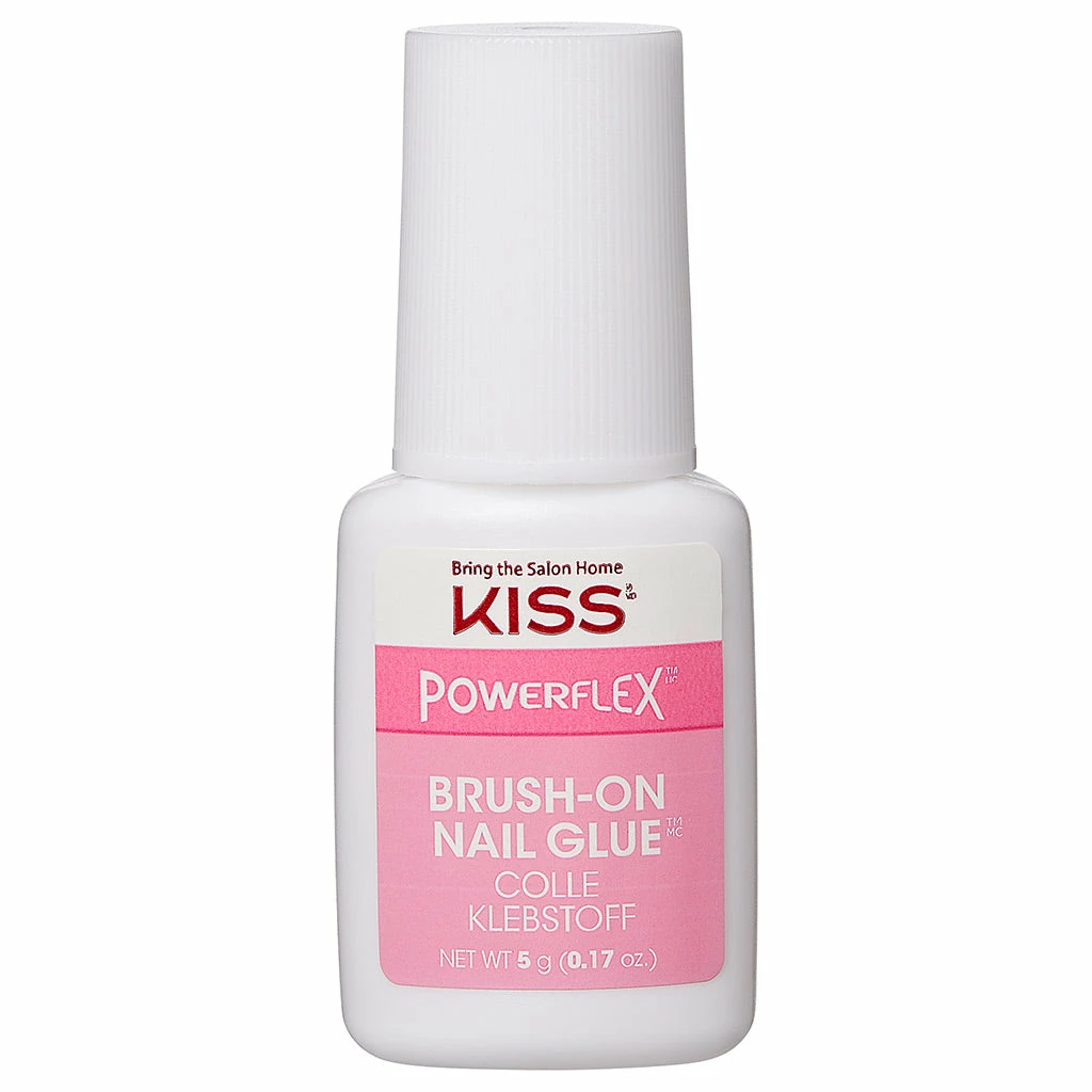 Kiss False Nails Powerflex Nail Glue Brush-on (5g) applies like nail polish. This high quality nail glue ensures that your false nails bond and stay on. This nail glue, by #1 nail brand Kiss, brushes on evenly.Â