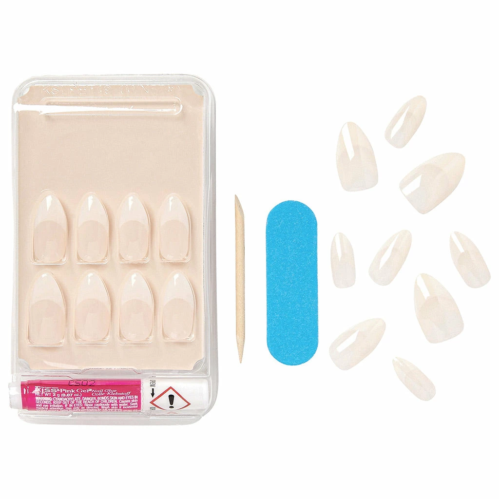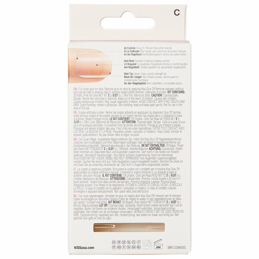 Kiss False Nails Salon Acrylic Nude French Nails in style Sensibility are long in length with a French nude finish. These revolutionary natural nails boast flexi-fit patented technology for a flawless fit, with no bubbles. These stunning ready to wear false nails last for up to 7 days.Â