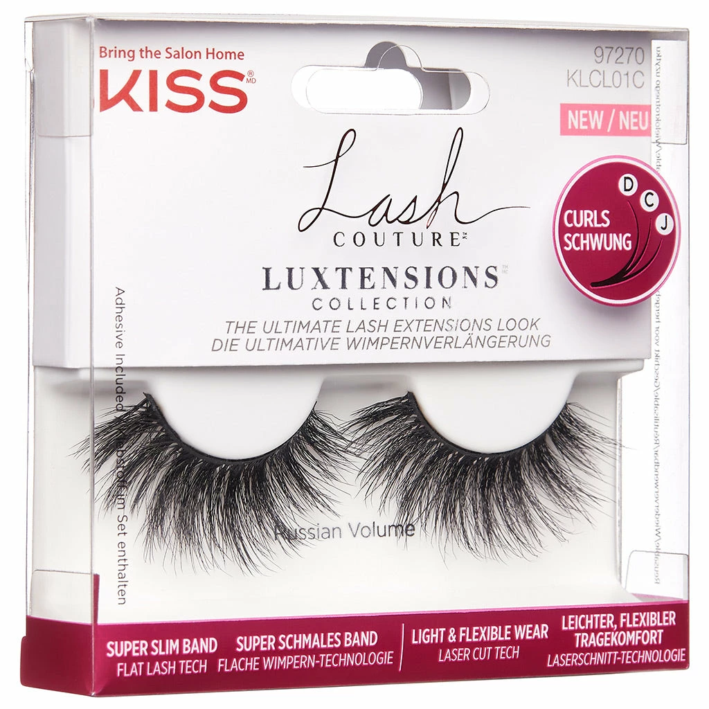 Kiss Lash Couture Luxtensions false lashes in style Russian Volume are designed to mimic the appearance of professional lash extensions. If you want professional-looking lashes without the expense or hassle, these strip lashes are the ones for you! Featuring a mix of D, C and J Curls this style offers a layered and full finish. Wispy, tapered ends provide a more natural appearance.