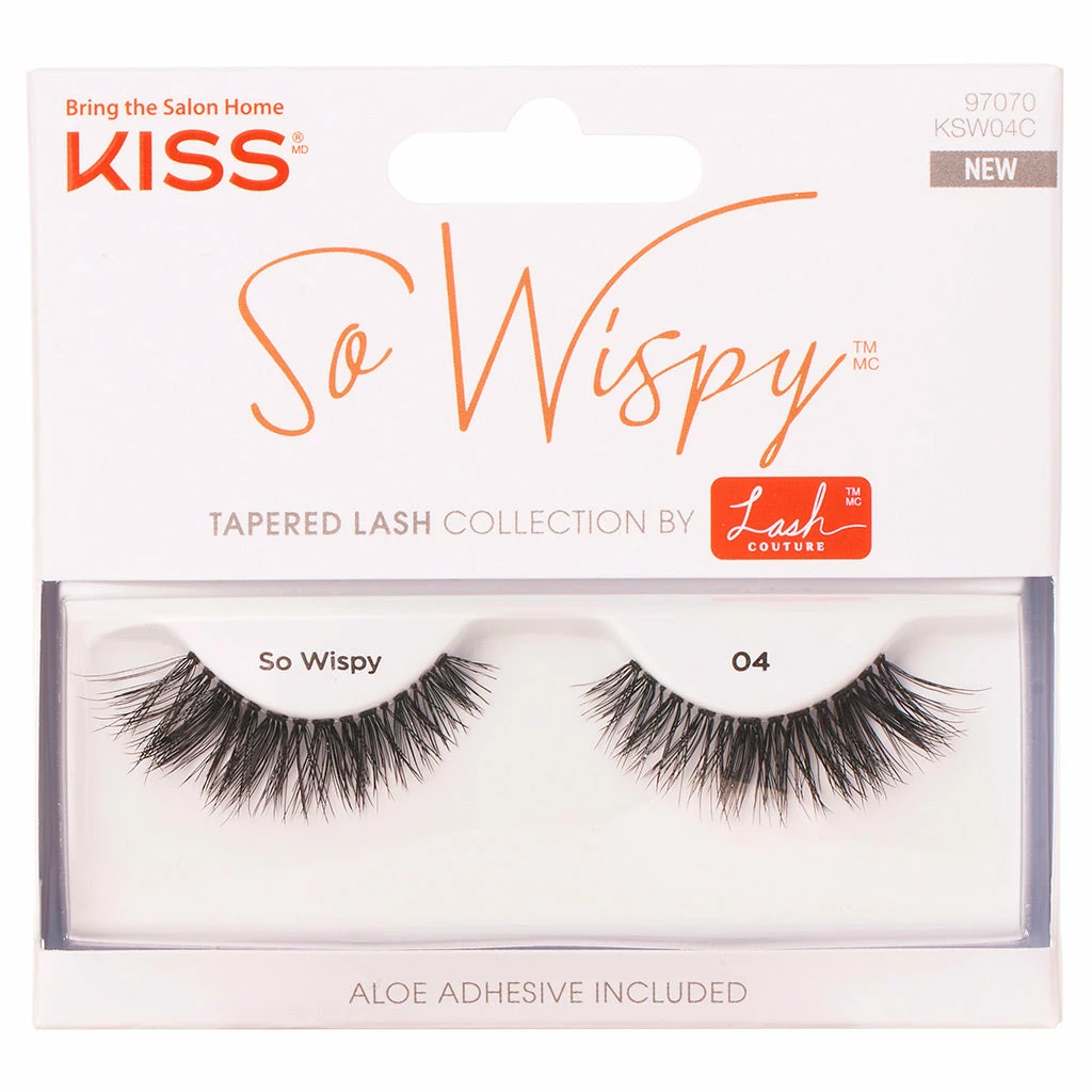 Kiss Lash Couture false lashes in style So Wispy 04 bring volume and a textured finish to the party! With dense clusters and a criss-cross design, these falsies make for a glamorous addition to any makeup look. Completely Cruelty-Free, these handmade lashes are high quality and easy to apply.