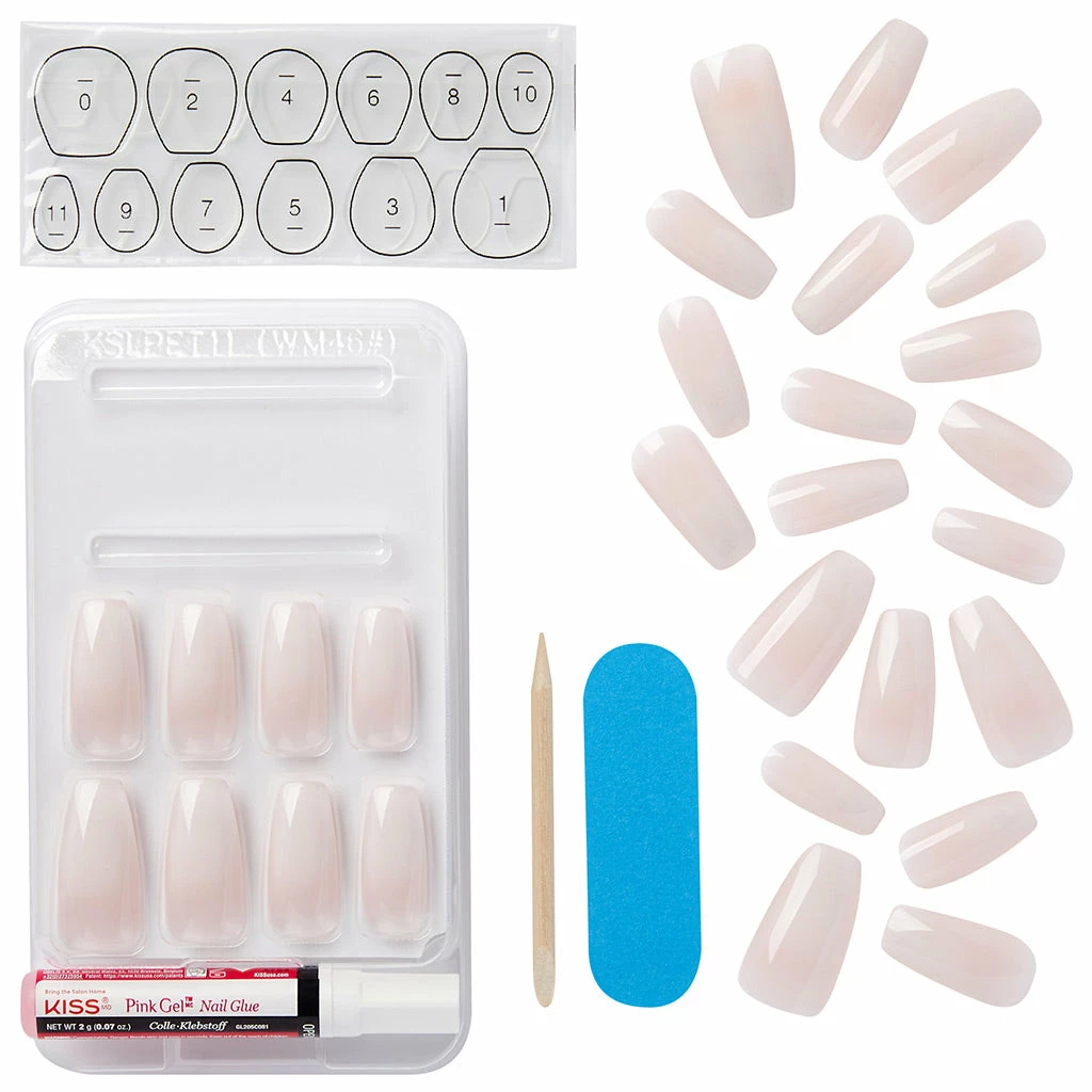 Kiss False Nails Classy Nails in style Be-you-tiful are long length and coffin-shaped, they offer a trendy shape and sophisticated style. For French nails redefined (and redesigned!), and for a flawless mani at home – without the expense or hassle of visiting the salon – these are the false nails for you. These false nails are durable and last for up to 7 days. These false nails are supplied ready to wear.