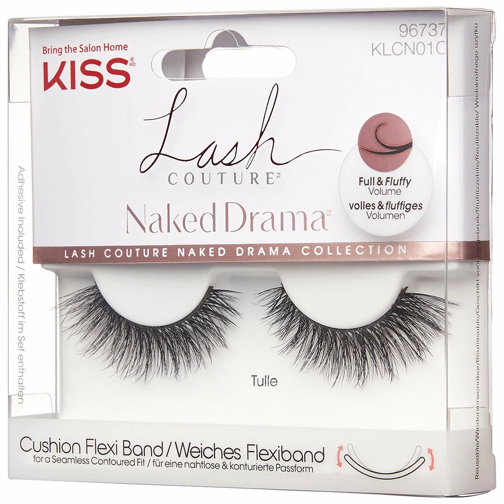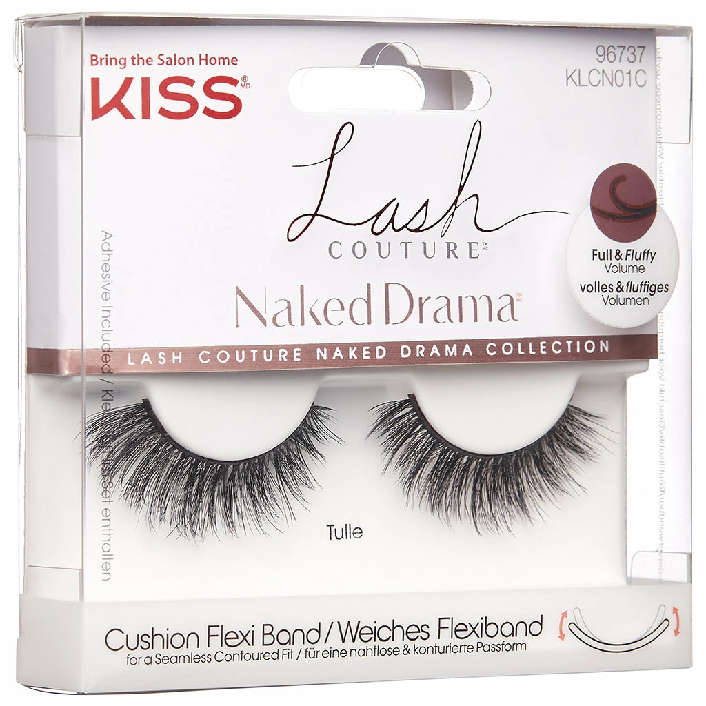 Kiss Lash Couture Naked Drama false eyelashes in style Tulle bring length and density to the party! These cute falsies boast tapered length and just the right amount of drama. For full and fluffy volume, look no further than Tulle lashes from the Kiss Naked Drama collection.