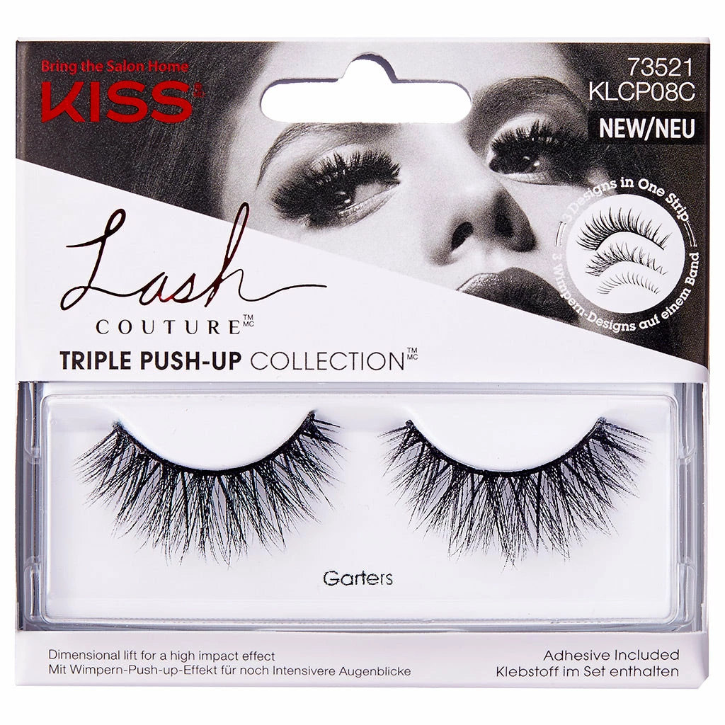 Kiss Lash Couture Triple Push-up Collection Lashes in style Garters are high quality, handmade falsies. With a dimensional appearance for a dramatic effect, these eyelashes boast three designs on one strip. These lashes really open up your eyes, making them the centre of attention.