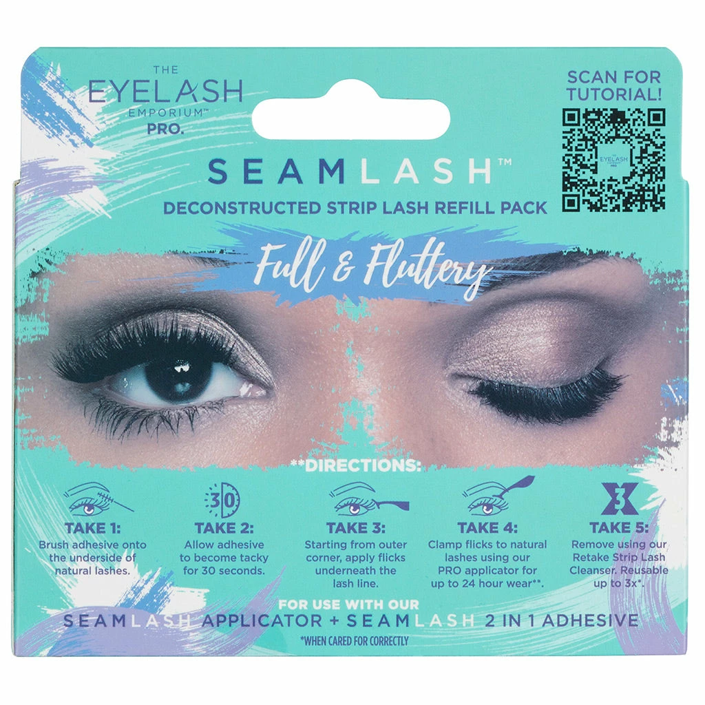 Each Eyelash Emporium Seamlash Full and Fluttery Refill Pack contains enough for 2 pairs of lashes. We stock the full Eyelash Emporium Seamlash range, and every order placed here at FalseEyelashes.co.uk comes with FREE 1st Class delivery in the UK when you spend £20+. Place your Eyelash Emporium Seamlash order with us now!