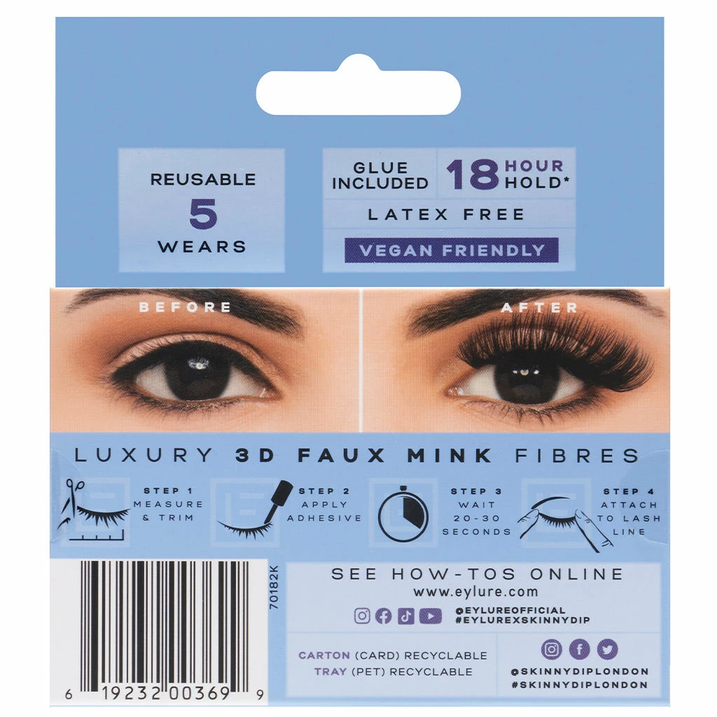Each pack contains one pair of Eylure x Skinnydip Enchanted Lashes in style Crescent. One 1ml, latex-free lash glue is also included. Every order placed here at FalseEyelashes.co.uk comes with FREE 1st Class delivery in the UK when you spend £20 or more. Don’t delay, place your Eylure order with us now!