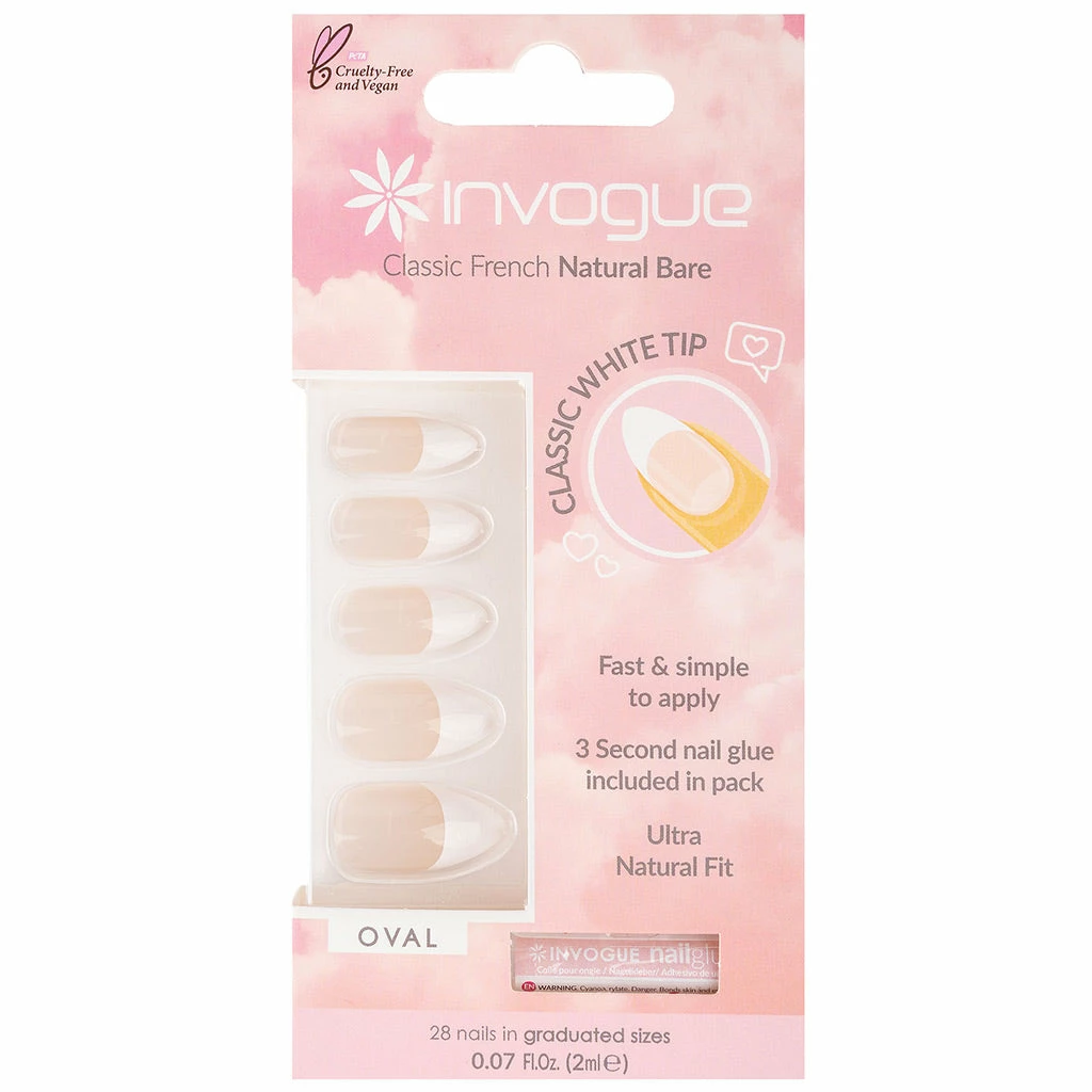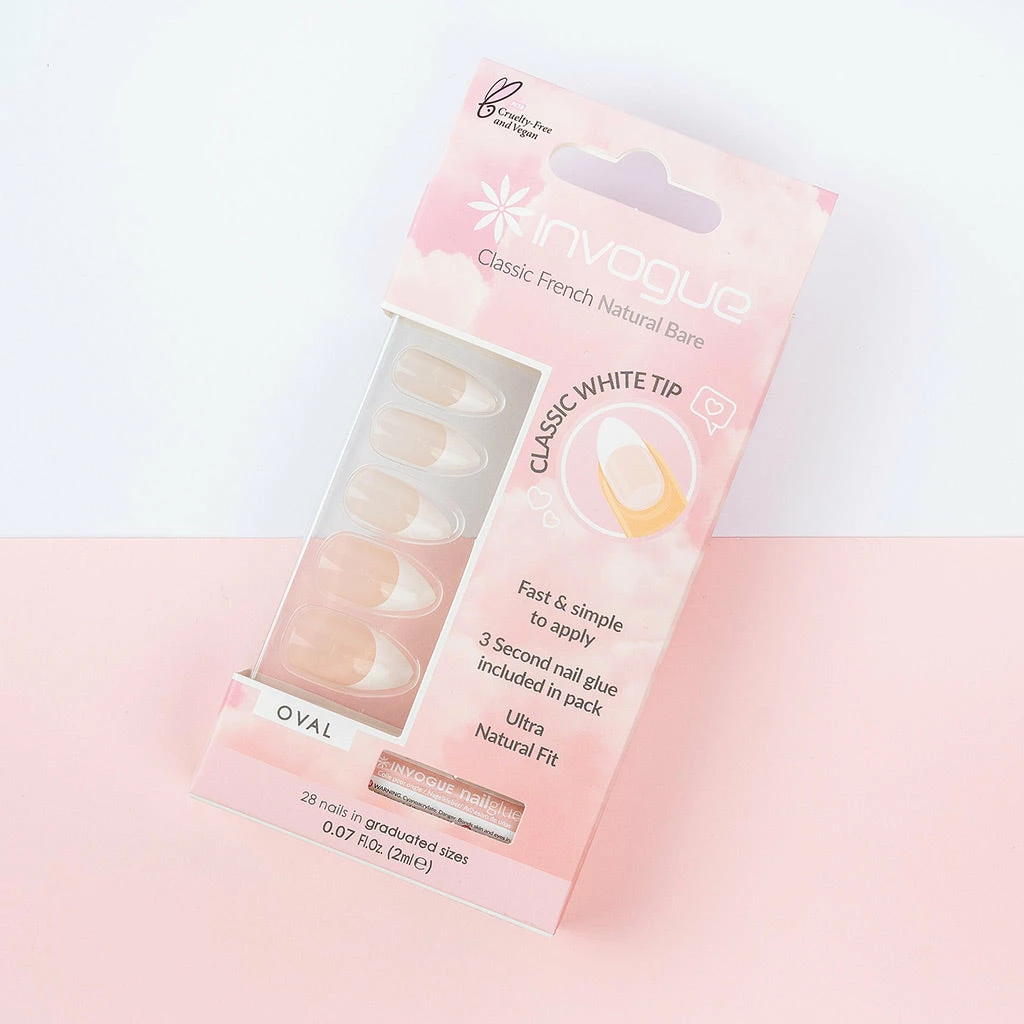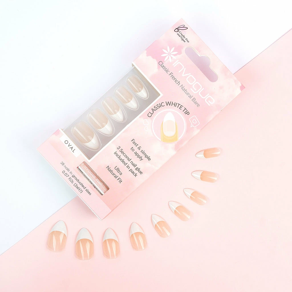 These Invogue False Nails are medium length and oval-shaped. They come in a natural bare shade, making them ideal for a classic French manicure. Invogue false nails are fast and simple to apply, and they offer an ultra-natural fit. If you’re looking for nails that boast a flawless manicured look without the expense of visiting a salon, then your search is over.