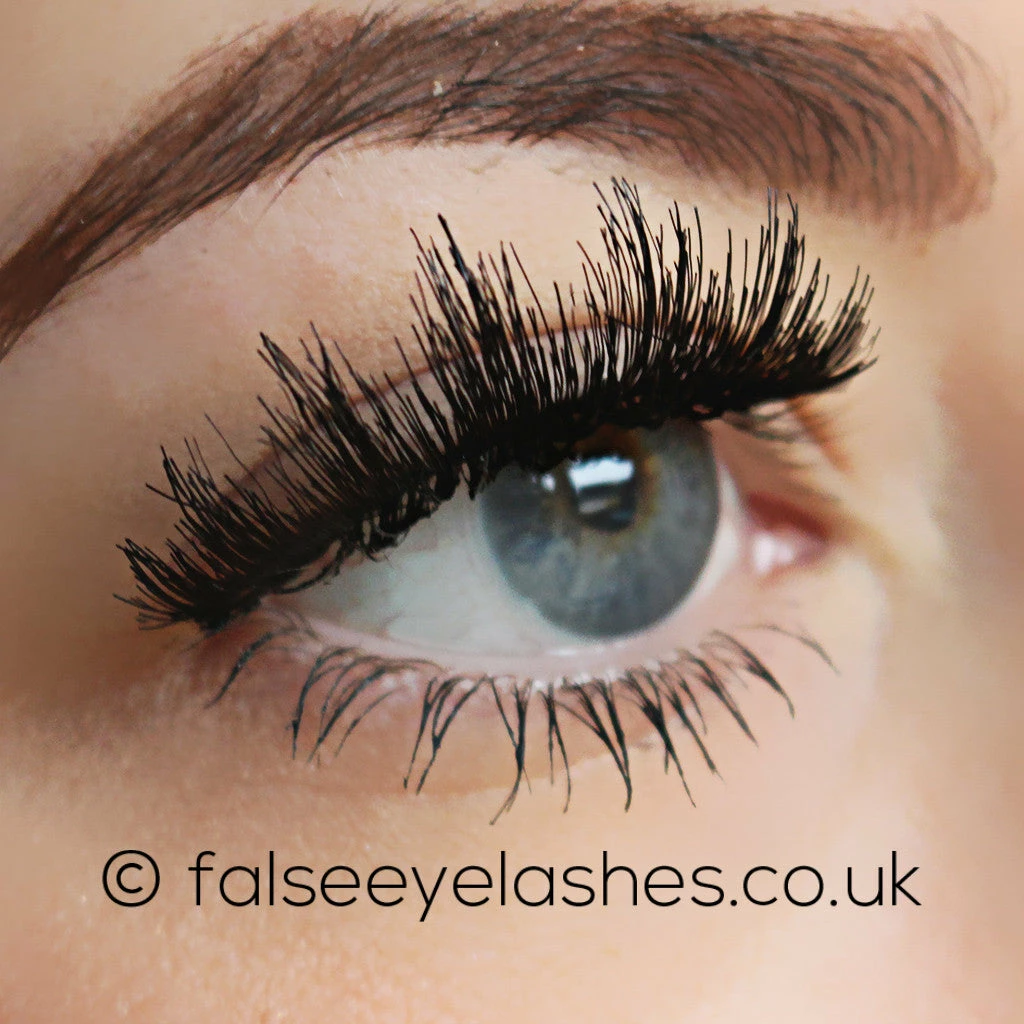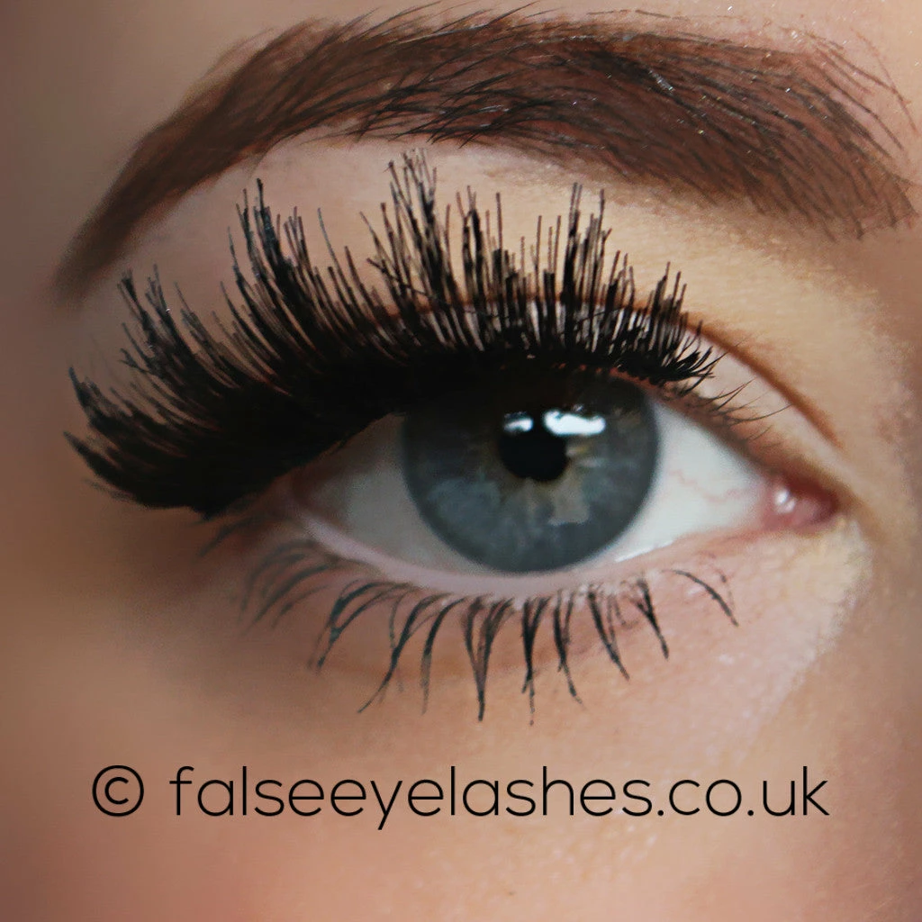 KoKo Lashes in style Risque features a unique, striking design. Consisting of clusters of thick, flared lashes these stunning falsies have wispy, curled tips for a dramatic look. The invisible band offers a discrete application and allows the lashes to blend with your own flawlessly. The lengthened lashes in the centre of the band provide a beautiful, eye enhancing effect, adding volume and a stunning finish.