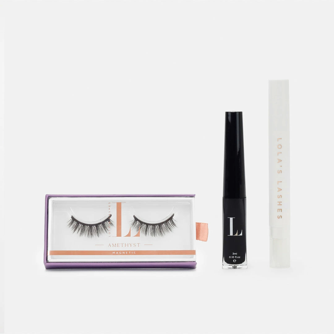 Lola’s Lashes magnetic lashes in style Amethyst promote a striking, eye-opening effect once applied. Designed with thick, longer lash clusters and fine shorter clusters with doll-like spacing to create a vintage lash look with a twist that is universally flattering.