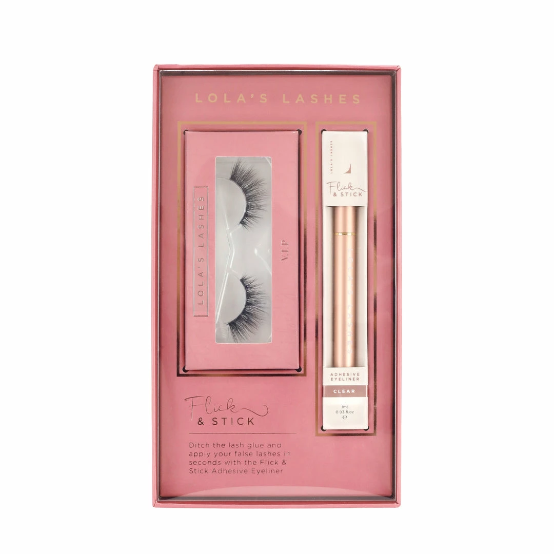 Ditch the lash glue and say hello to the Lola’s Lashes Flick & Stick Kit in style VIP! This super kit contains everything you need to take your lash look to the next level in a matter of seconds. Wave goodbye to traditional tubes of eyelash glue, and say hello to the easiest lash applicator eyeliner pen you’ll ever use. Flick & Stick’s mess and latex-free formula makes it a joy to use. Each Lola’s Lashes Flick & Stick Kit in style VIP contains: