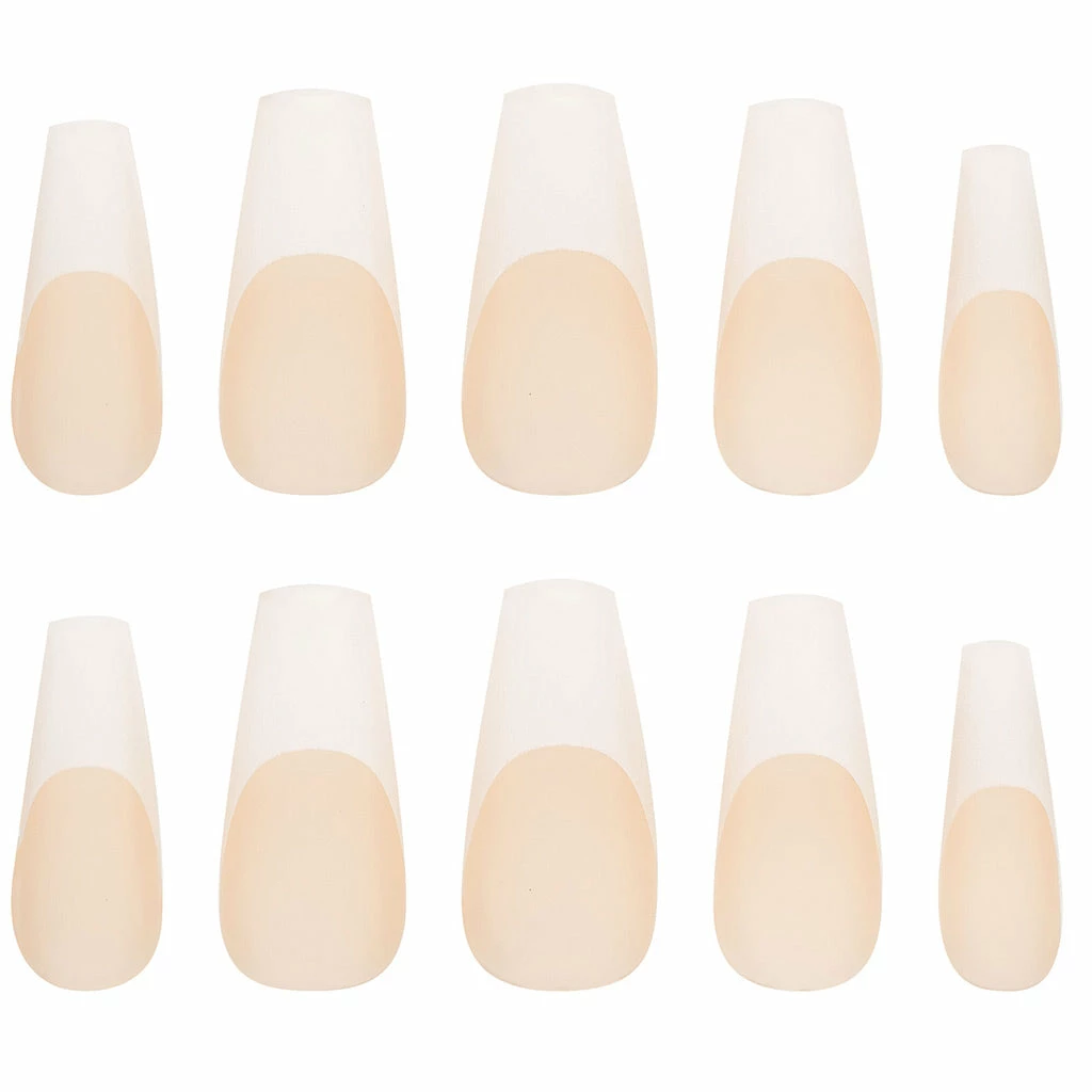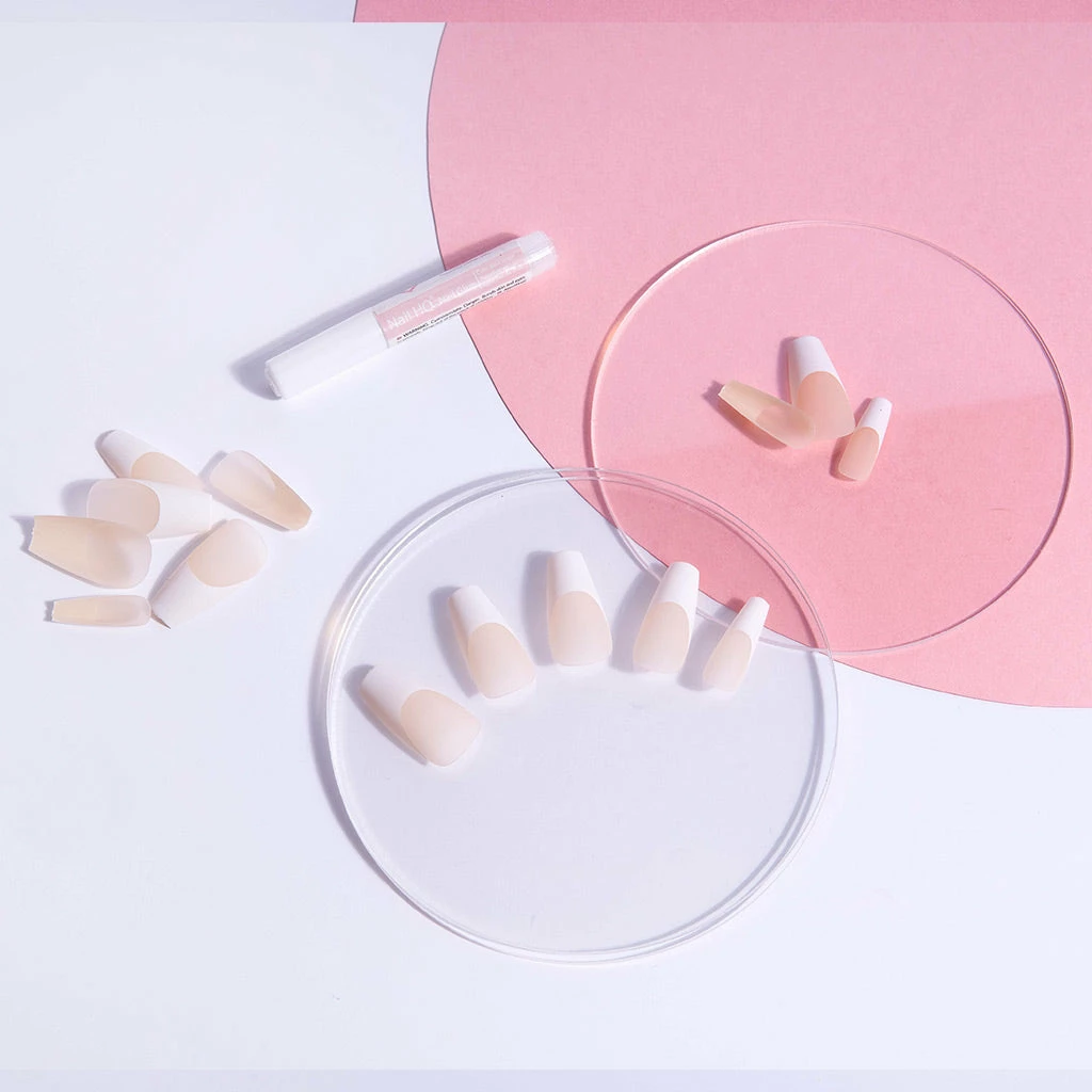 These Nail HQ False Nails are long and coffin-shaped with an ultra-natural matte pink hue. Presented with a thick white tip, these false nails offer a timeless yet fashionable look once applied. If you’re looking for nails that offer a modern and flawless manicured look without the expense of visiting a salon, then your search is over.