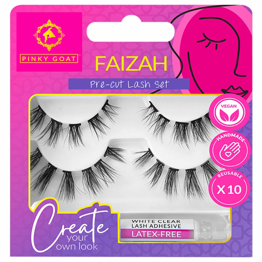 The Pinky Goat Pre-Cut Lash Set in style Faizah offers super stylish false lash sections for you to create your very own, custom lash look! Simply apply each section along the lash line for a traditional strip lash style look – layer them for extra volume and drama.