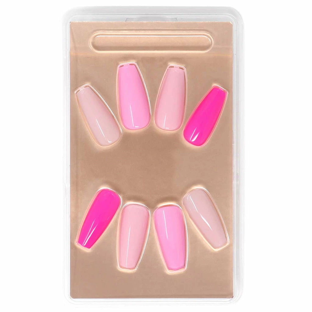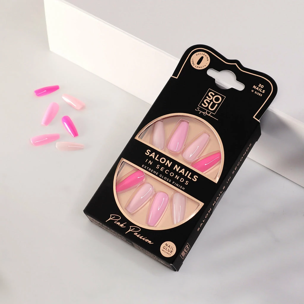 SOSU by SJ False Nails in style Pink Passion are ballerina-shaped and long in length. If you want to make a bold statement, then these stand-out nails are for you. Containing a mixture of neon and soft pastel pinks, these false nails are a must-have this spring/summer.