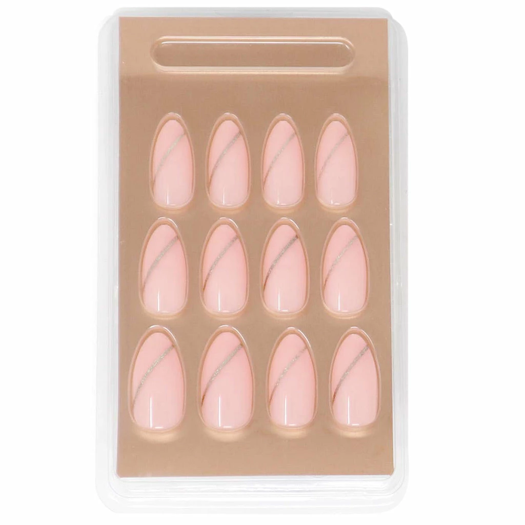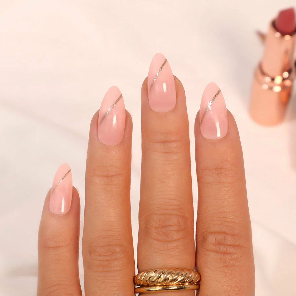 SOSU by SJ False Nails in style Goldfinger are Stiletto shape in Medium Length. These high quality false nails offer easy application and removal. If you want to achieve salon style nails with an extreme gloss finish in mere seconds, then these are the false nails for you! Add a touch of sparkle to the perfect pink manicure thanks to these pretty pink nails with a single gold stripe nail art.