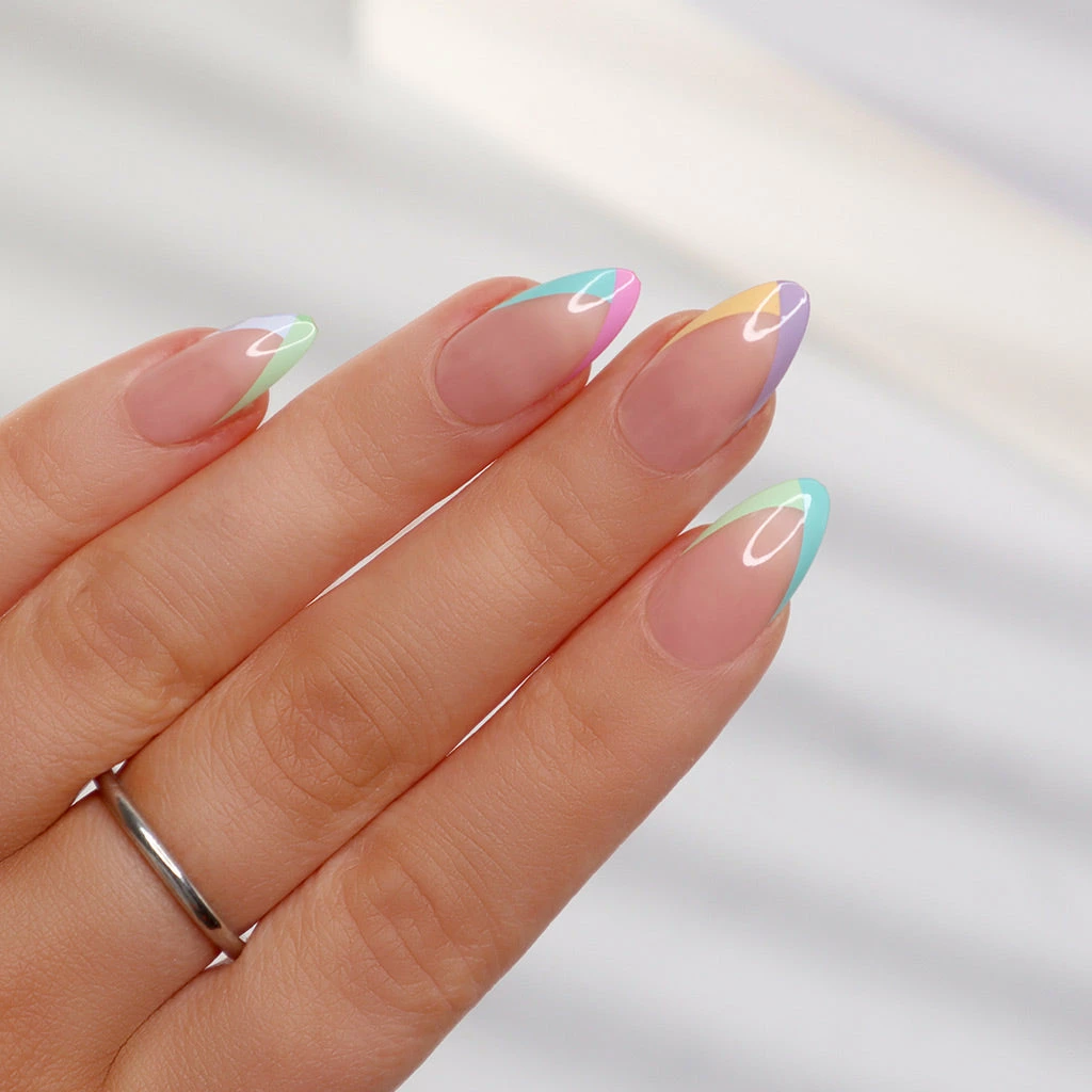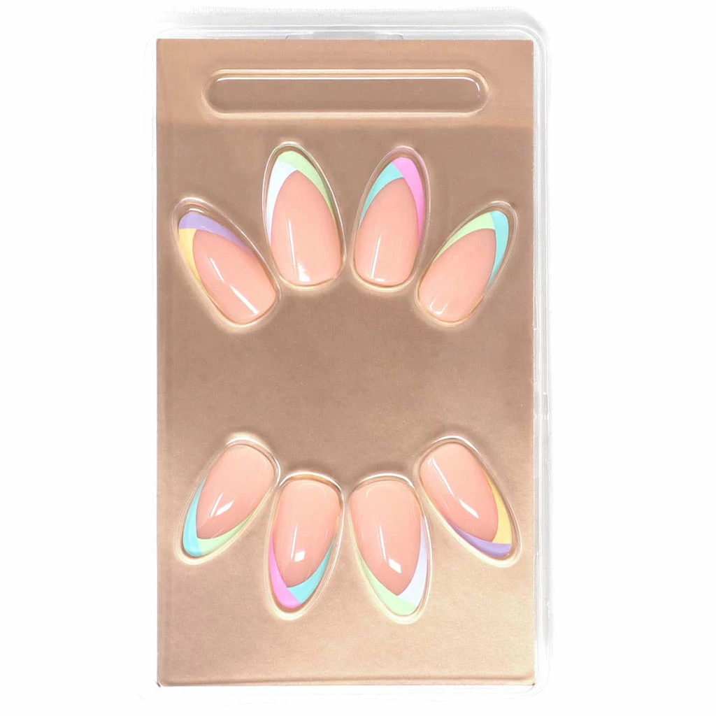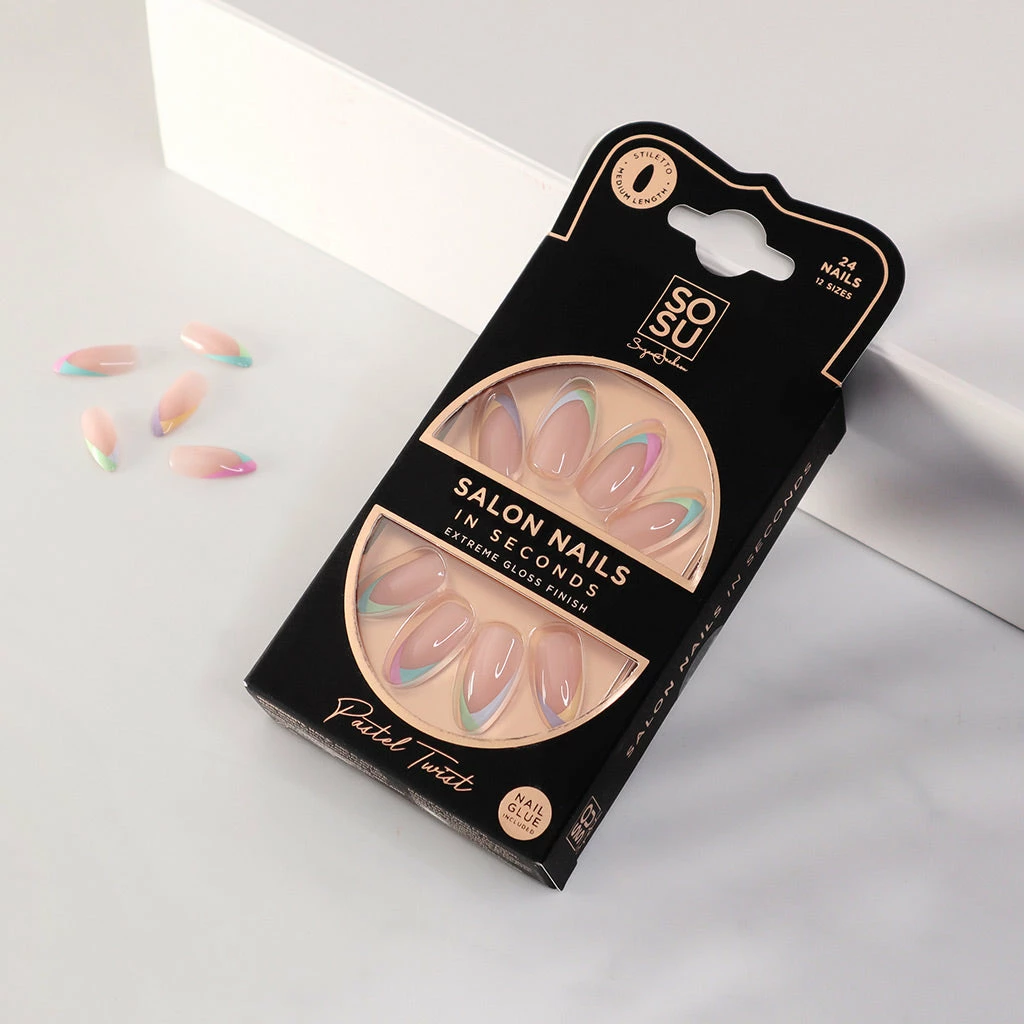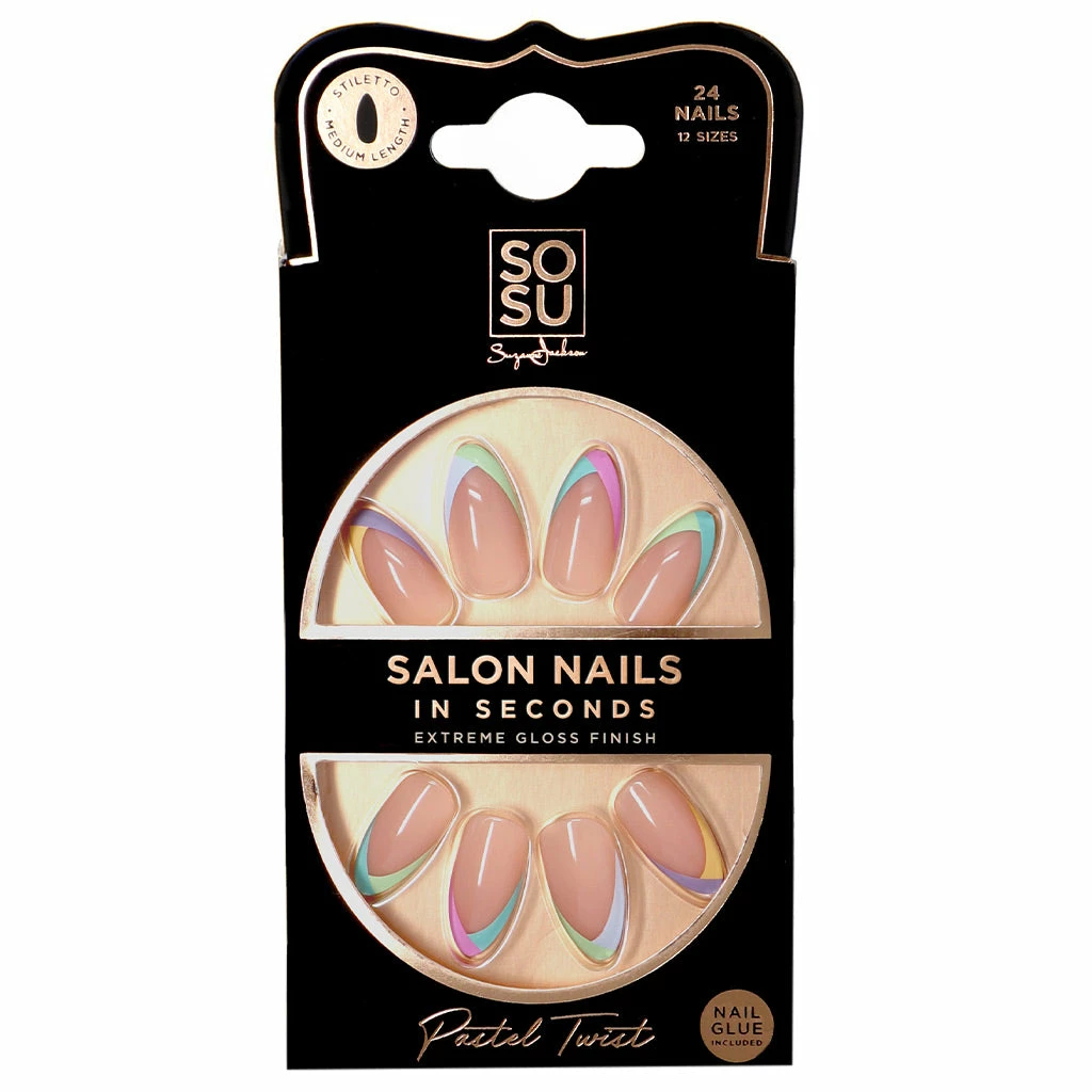 SOSU by SJ False Nails in style Pastel Twist are stiletto-shaped and medium in length. These beautiful nude nails each boast subtle pastel-coloured tips. For salon nails in seconds and an extreme gloss finish, look no further than these stunning false nails.